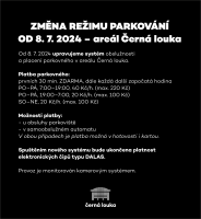 Od 8. 7. 2024 dochází k úpravě systému obslužnosti a placení parkovného v areálu Černá louka.